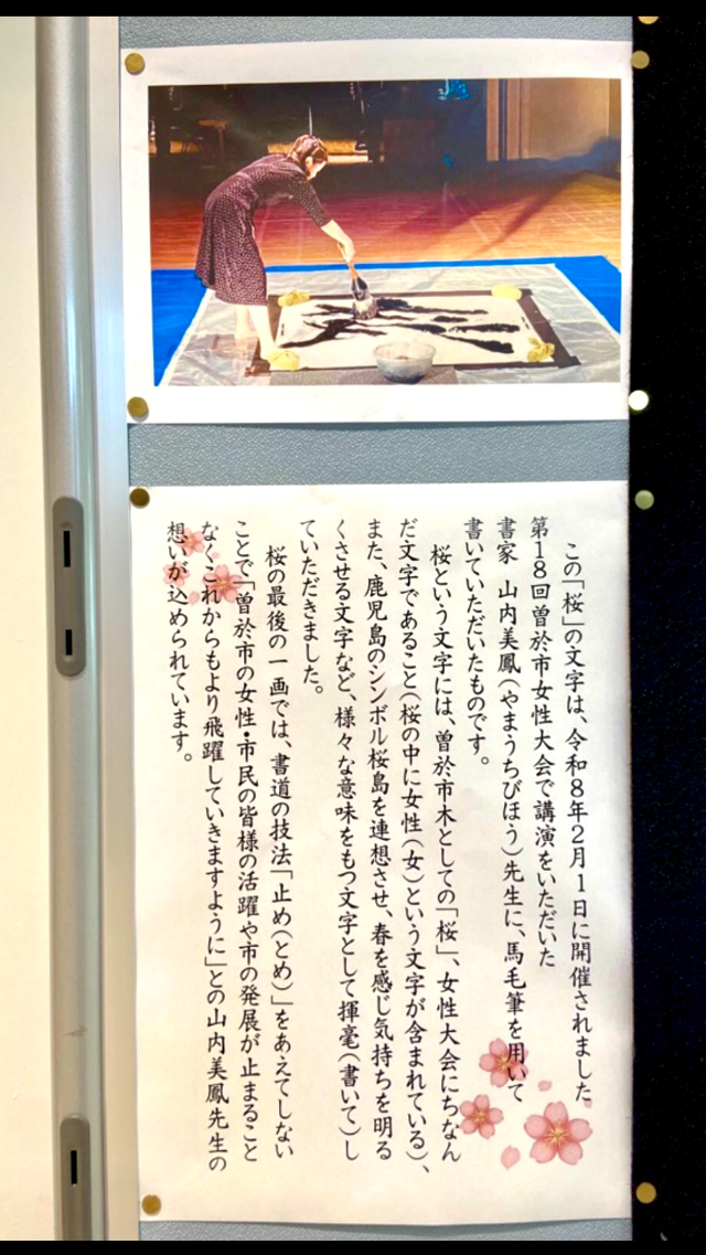揮毫作品『桜』は曽於市役所ロビーにて常設展示